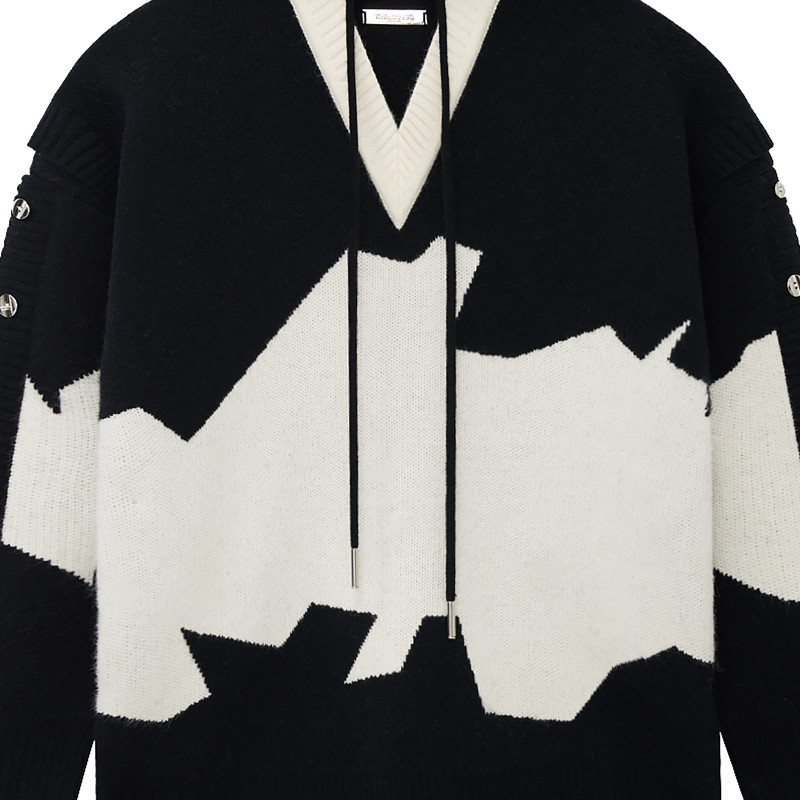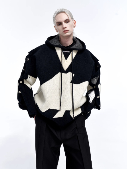 Black And White Fake Two-piece Embroidered Hooded Knitted Hoodie Jacket For Men